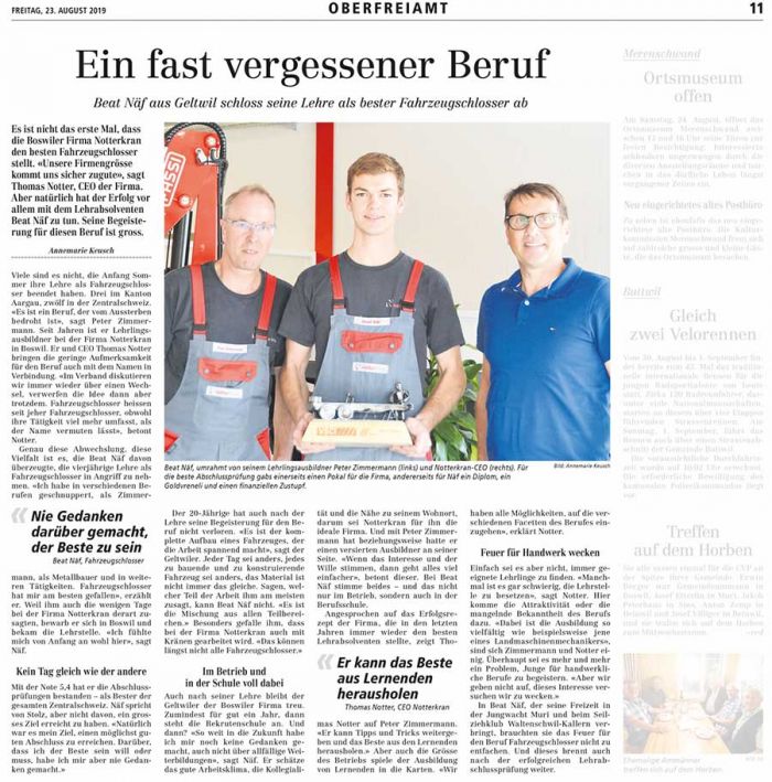 Es ist nicht das erste Mal, dass die Boswiler Firma Notterkran den besten Fahrzeugschlosser stellt. «Unsere Firmengrösse kommt uns sicher zugute», sagt Thomas Notter, CEO der Firma. Aber natürlich hat der Erfolg vor allem mit dem Lehrabsolventen Beat Näf zu tun. Seine Begeisterung für diesen Beruf ist gross.